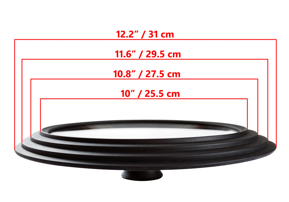 Uniwersalna pokrywka szklana - wielorozmiarowa, zewnętrzne krawędzie 12,2” / 31 cm średnicy, do garnków i patelni, czarna